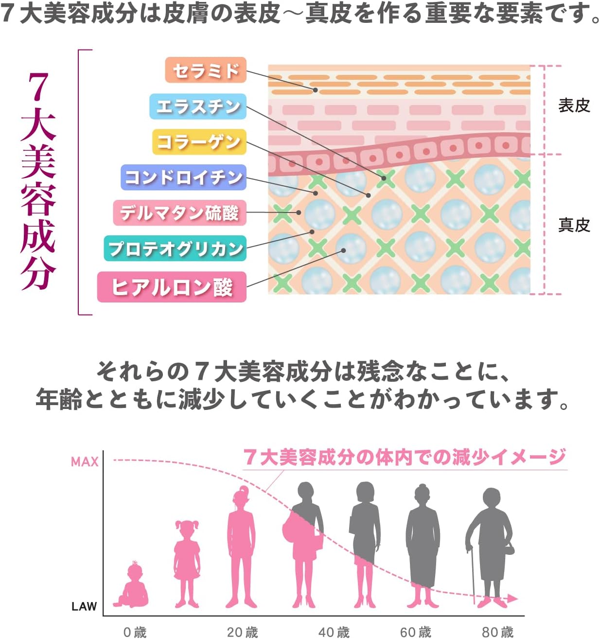 7大美容成分(ヒアルロン酸・エラスチン・コラーゲン・コンドロイチン・デルマタン・プロテオグリカン・セラミド)